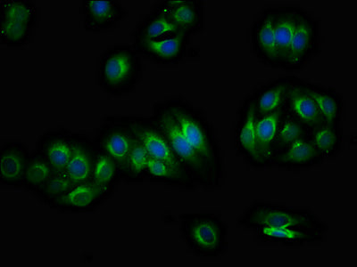 Immunofluorescence staining of HepG2 cells with PIRT Antibody at 1:66, counter-stained with DAPI. The cells were fixed in 4% formaldehyde, permeabilized using 0.2% Triton X-100 and blocked in 10% normal Goat Serum. The cells were then incubated with the antibody overnight at 4°C. The secondary antibody was Alexa Fluor 488-congugated AffiniPure Goat Anti-Rabbit IgG(H+L).