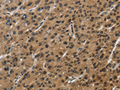 The image on the left is immunohistochemistry of paraffin-embedded Human liver cancer tissue using the antibody Antibody) at dilution 1/50, on the right is treated with synthetic peptide. (Original magnification: ×200)