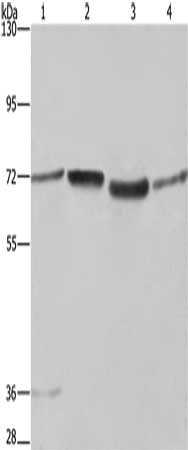 Gel: 6%SDS-PAGE, Lysate: 40 μg, Lane 1-4: A375 cells, 231 cells, 293T cells, human hepatocellular carcinoma tissue, Primary antibody: SYN1 Antibody(SYN1 Antibody) at dilution 1/550, Secondary antibody: Goat anti rabbit IgG at 1/8000 dilution, Exposure time: 40 seconds