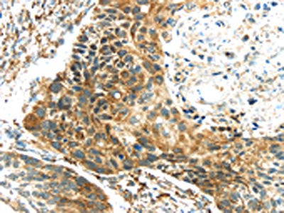 The image on the left is immunohistochemistry of paraffin-embedded Human esophagus cancer tissue using TGM4 Antibody(TGM4 Antibody) at dilution 1/20, on the right is treated with fusion protein. (Original magnification: ×200)