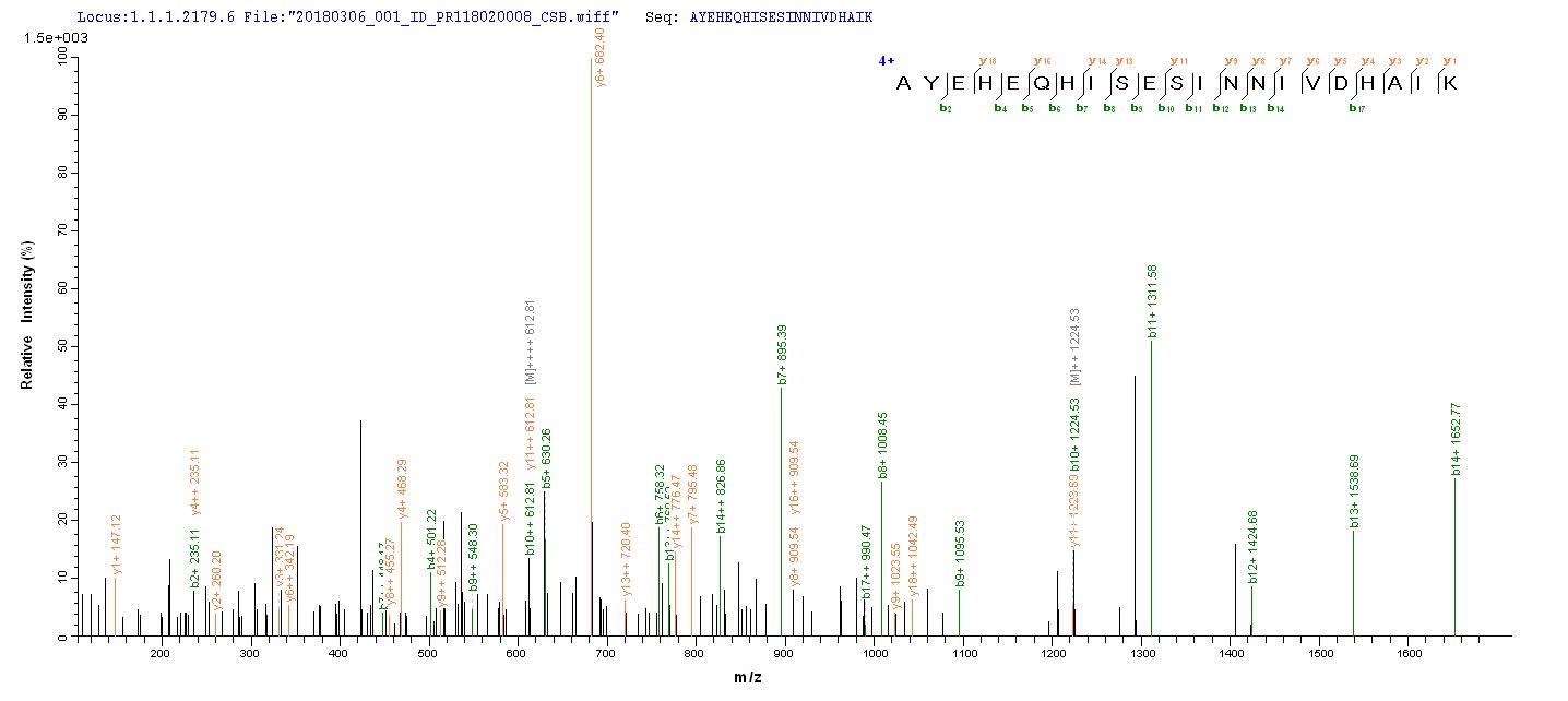 Based on the SEQUEST from database of Yeast host and target protein, the LC-MS/MS Analysis result of this product could indicate that this peptide derived from Yeast-expressed Helicobacter pylori (strain ATCC 700392 / 26695) (Campylobacter pylori) ftnA.