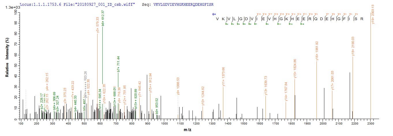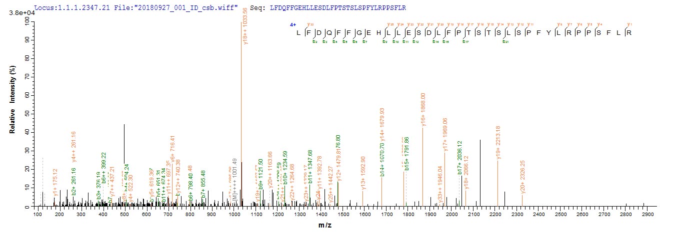 Based on the SEQUEST from database of E.coli host and target protein, the LC-MS/MS Analysis result of this product could indicate that this peptide derived from E.coli-expressed Homo sapiens (Human) CRYAB.