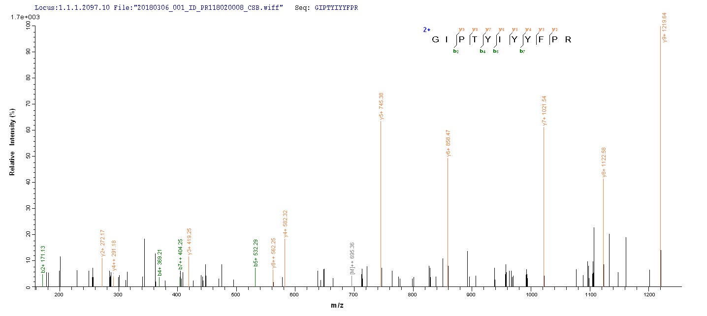 Based on the SEQUEST from database of E.coli host and target protein, the LC-MS/MS Analysis result of this product could indicate that this peptide derived from E.coli-expressed Homo sapiens (Human) CHD1L.