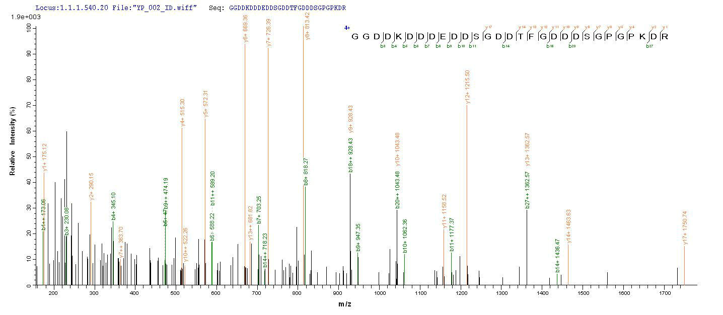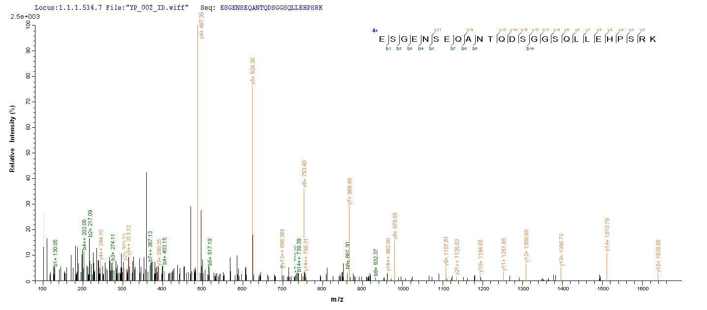 Based on the SEQUEST from database of Yeast host and target protein, the LC-MS/MS Analysis result of this product could indicate that this peptide derived from Yeast-expressed Homo sapiens (Human) DMP1.