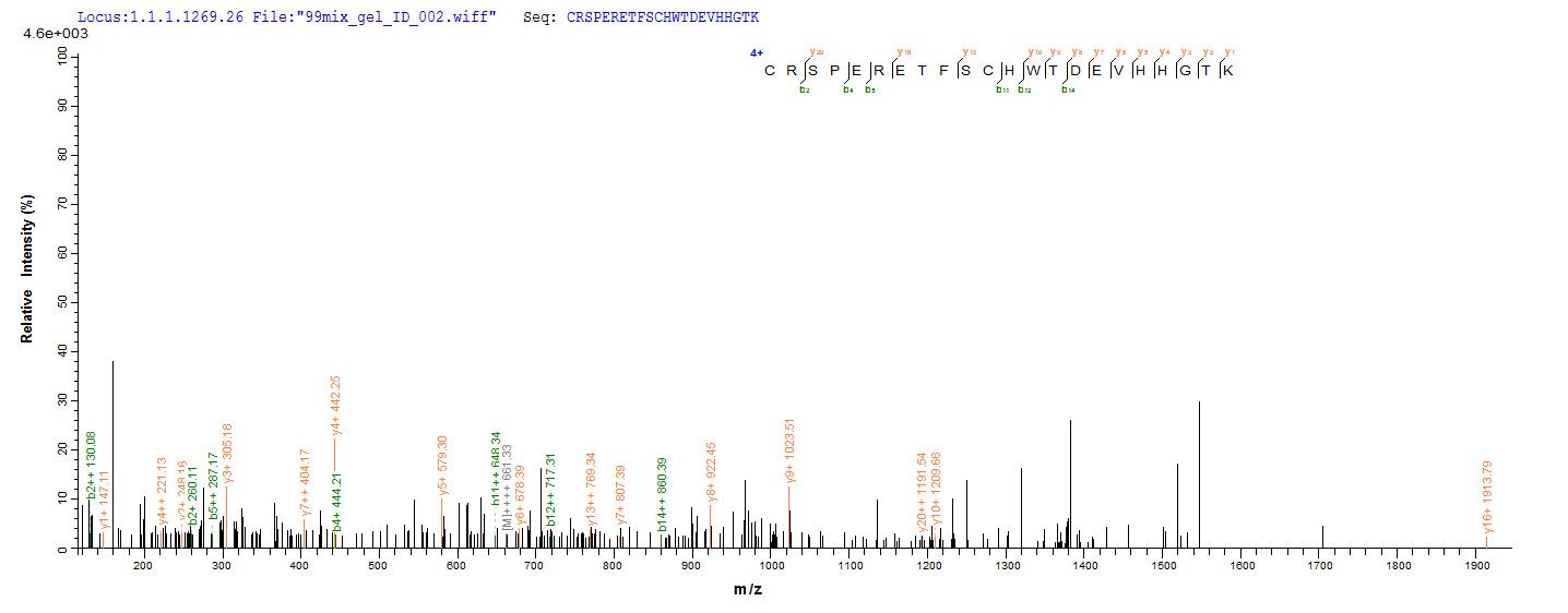 Based on the SEQUEST from database of E.coli host and target protein, the LC-MS/MS Analysis result of this product could indicate that this peptide derived from E.coli-expressed Homo sapiens (Human) GHR.
