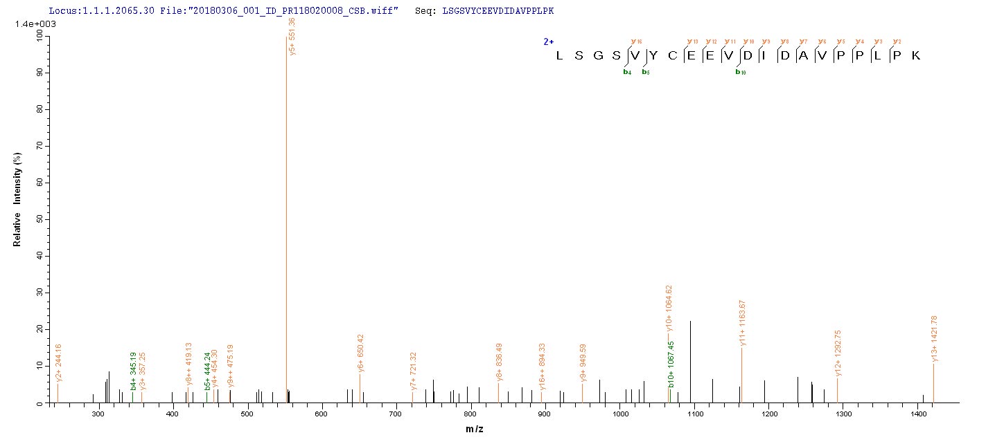 Based on the SEQUEST from database of Yeast host and target protein, the LC-MS/MS Analysis result of this product could indicate that this peptide derived from Yeast-expressed Homo sapiens (Human) OGN.