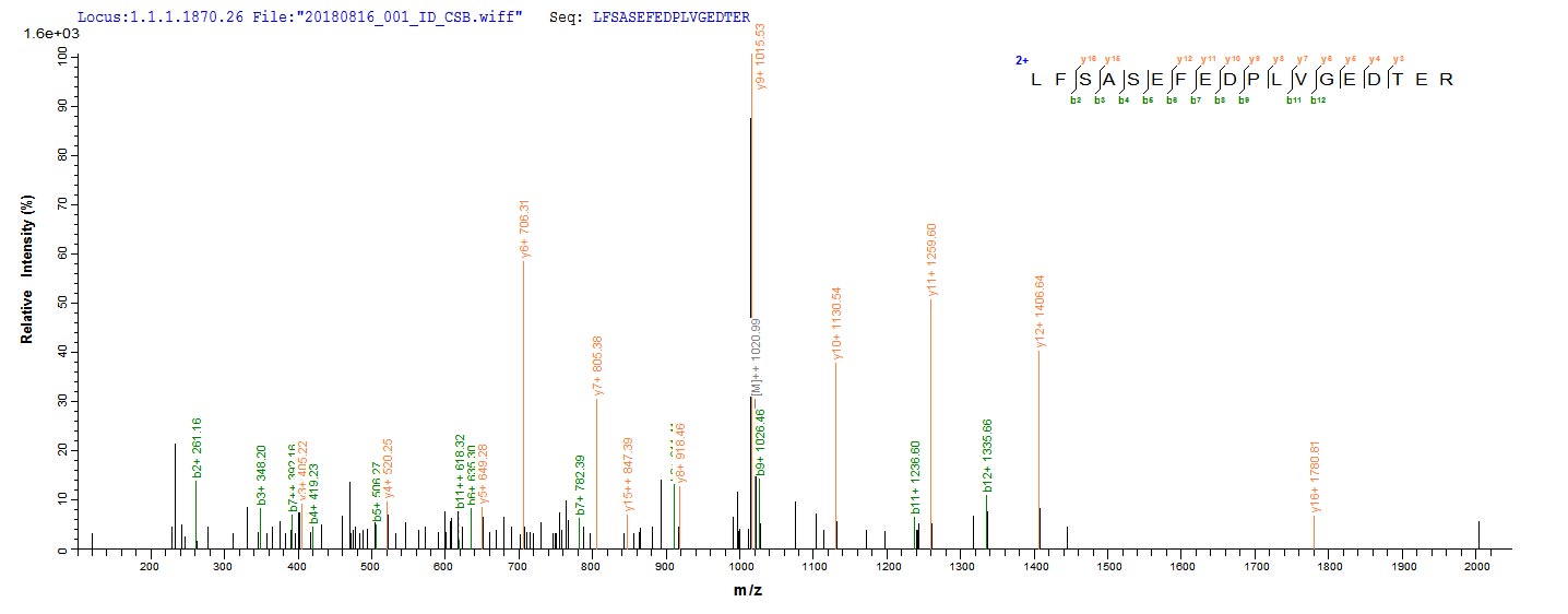 Based on the SEQUEST from database of E.coli host and target protein, the LC-MS/MS Analysis result of this product could indicate that this peptide derived from E.coli-expressed Homo sapiens (Human) FDFT1.
