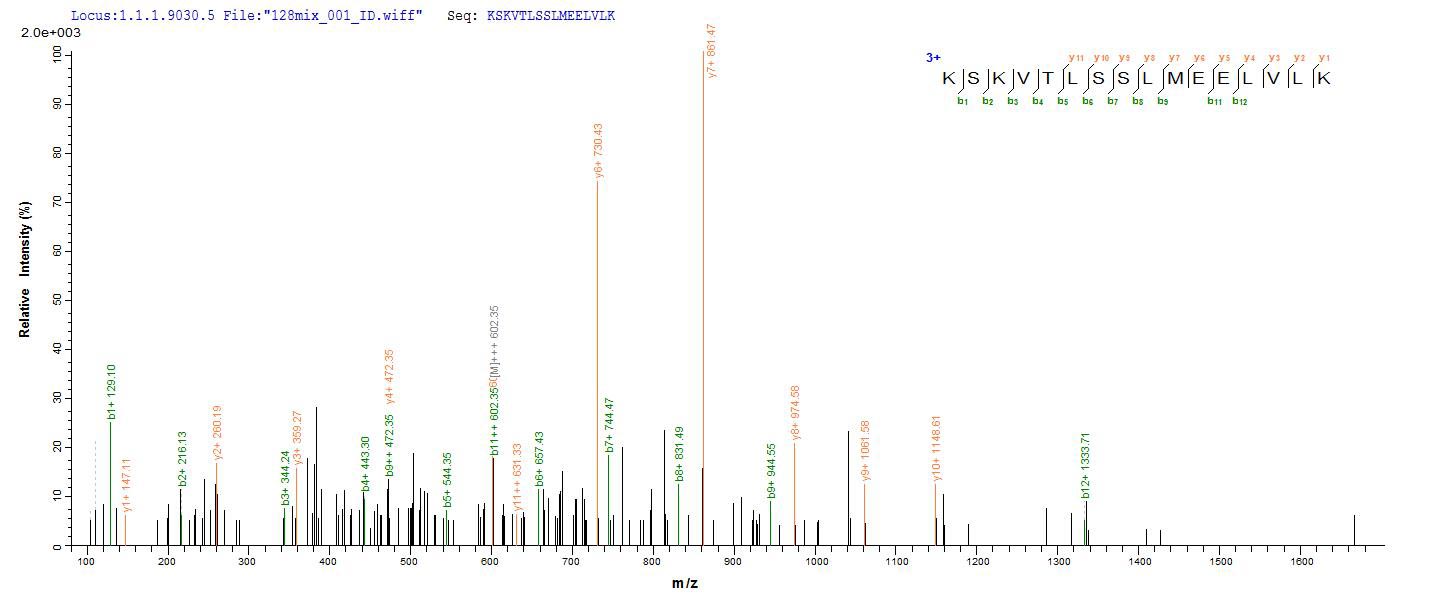 Based on the SEQUEST from database of E.coli host and target protein, the LC-MS/MS Analysis result of this product could indicate that this peptide derived from E.coli-expressed Homo sapiens (Human) TTN.