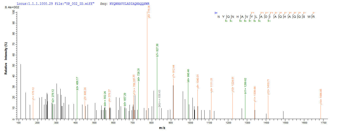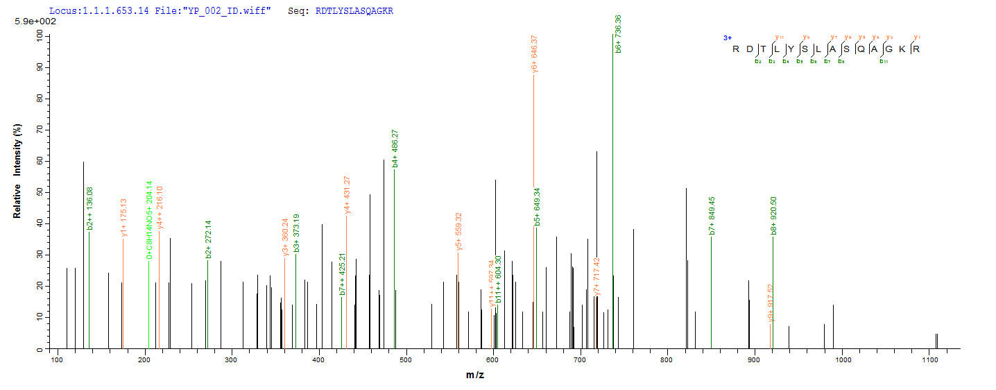 Based on the SEQUEST from database of Yeast host and target protein, the LC-MS/MS Analysis result of this product could indicate that this peptide derived from Yeast-expressed Hypocrea rufa (Trichoderma viride) 6GAL.