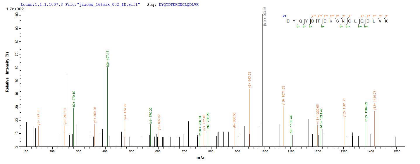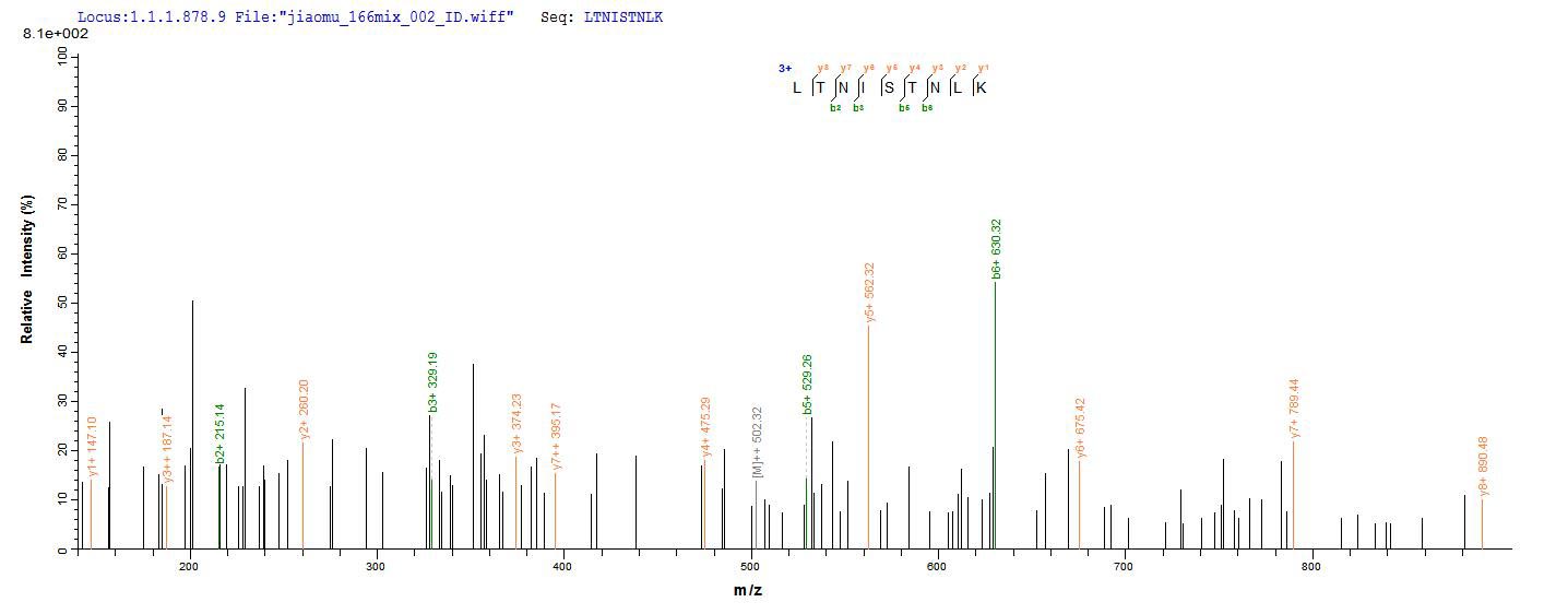 Based on the SEQUEST from database of E.coli host and target protein, the LC-MS/MS Analysis result of this product could indicate that this peptide derived from E.coli-expressed Mannheimia haemolytica (Pasteurella haemolytica) lktA.