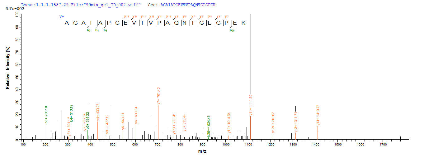 Based on the SEQUEST from database of E.coli host and target protein, the LC-MS/MS Analysis result of this product could indicate that this peptide derived from E.coli-expressed Mus musculus (Mouse) Rplp0.
