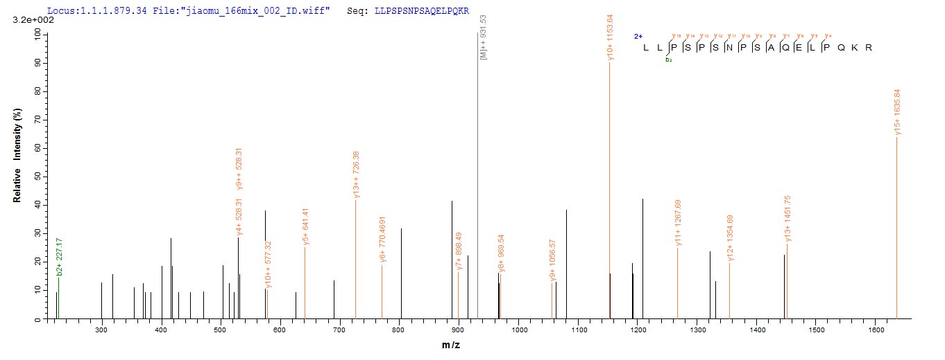 Based on the SEQUEST from database of E.coli host and target protein, the LC-MS/MS Analysis result of this product could indicate that this peptide derived from E.coli-expressed Mus musculus (Mouse) Aebp1.
