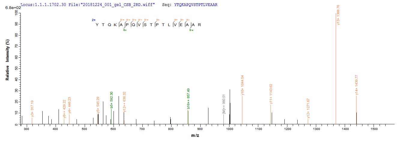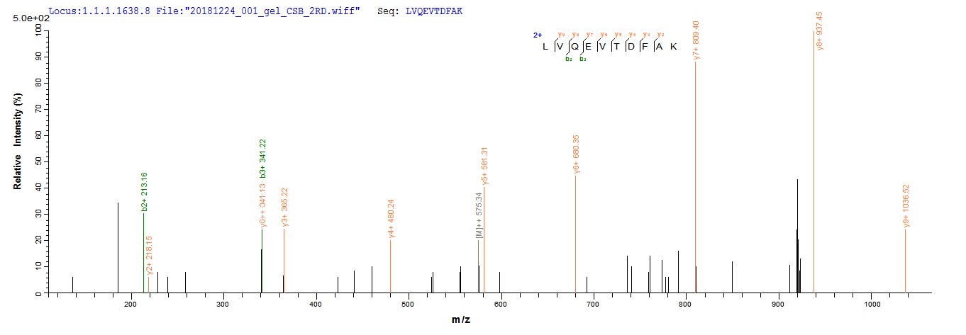 Based on the SEQUEST from database of Yeast host and target protein, the LC-MS/MS Analysis result of this product could indicate that this peptide derived from Yeast-expressed Mus musculus (Mouse) Alb.