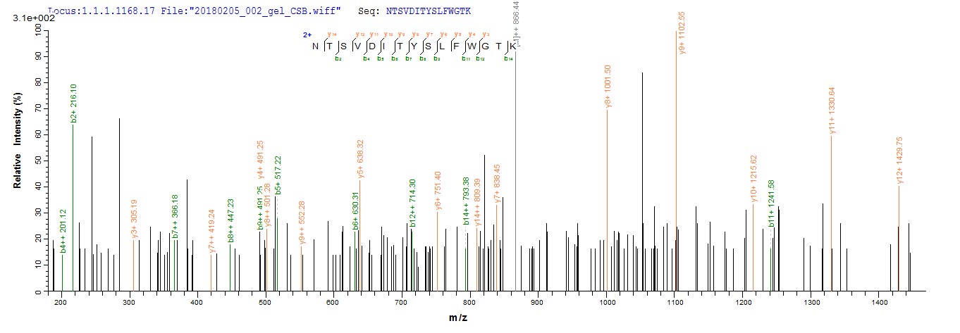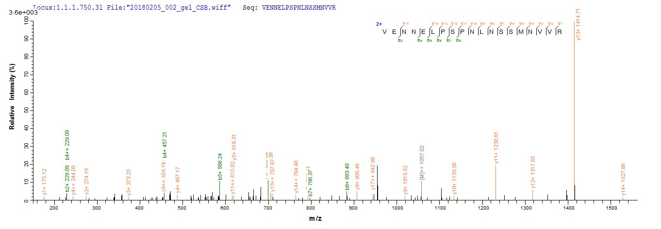 Based on the SEQUEST from database of E.coli host and target protein, the LC-MS/MS Analysis result of this product could indicate that this peptide derived from E.coli-expressed Mus musculus (Mouse) Milr1.