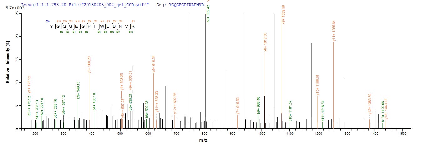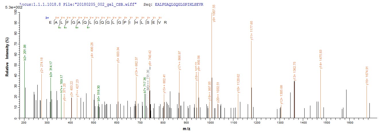 Based on the SEQUEST from database of E.coli host and target protein, the LC-MS/MS Analysis result of this product could indicate that this peptide derived from E.coli-expressed Mus musculus (Mouse) Loxl4.