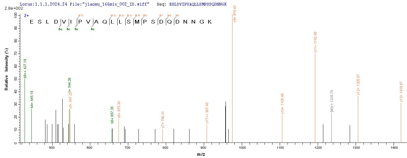 Based on the SEQUEST from database of Yeast host and target protein, the LC-MS/MS Analysis result of this product could indicate that this peptide derived from Yeast-expressed Mus musculus (Mouse) Spp1.
