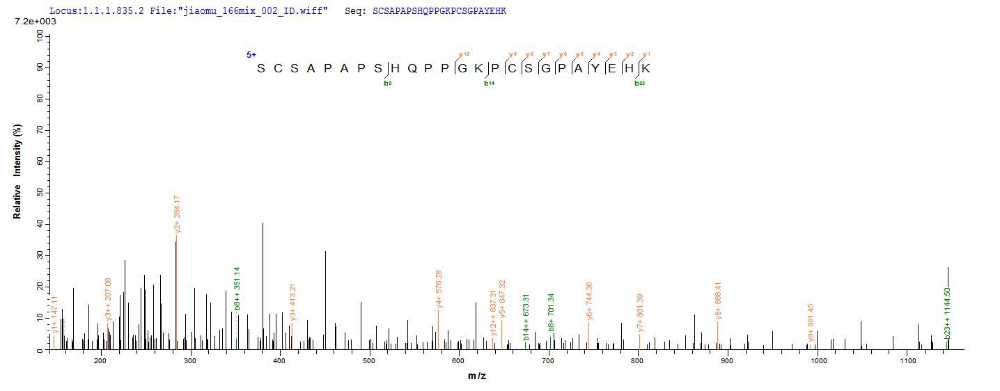 Based on the SEQUEST from database of Yeast host and target protein, the LC-MS/MS Analysis result of this product could indicate that this peptide derived from Yeast-expressed Mus musculus (Mouse) Cfp.