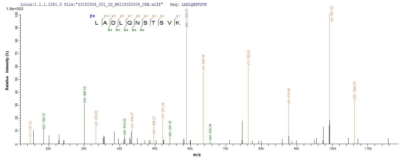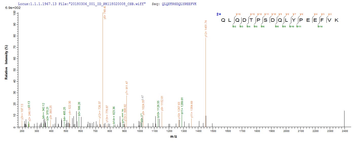 Based on the SEQUEST from database of E.coli host and target protein, the LC-MS/MS Analysis result of this product could indicate that this peptide derived from E.coli-expressed Mycoplasma pneumoniae (strain ATCC 29342 / M129) pepA.