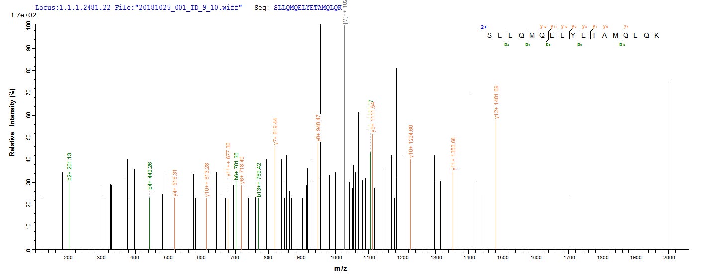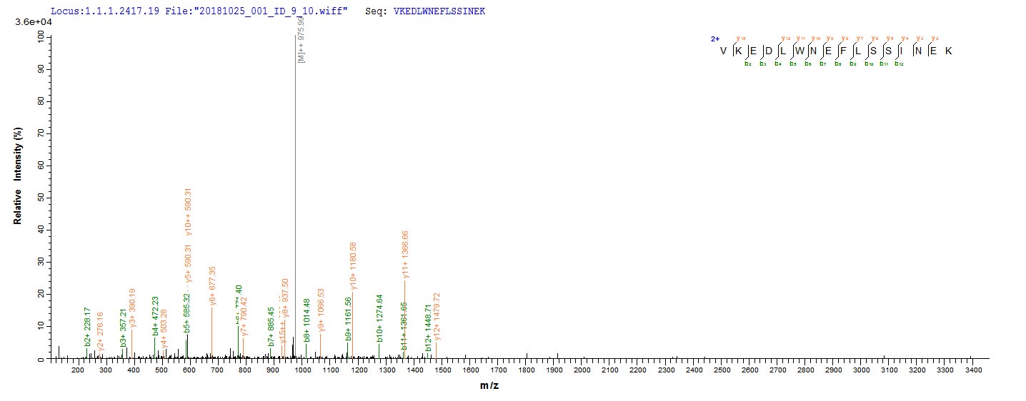 Based on the SEQUEST from database of Yeast host and target protein, the LC-MS/MS Analysis result of this product could indicate that this peptide derived from Yeast-expressed Saccharomyces cerevisiae (strain ATCC 204508 / S288c) (Baker's yeast) ECM31.