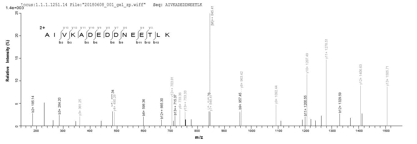 Based on the SEQUEST from database of Yeast host and target protein, the LC-MS/MS Analysis result of this product could indicate that this peptide derived from Yeast-expressed Vaccinia virus (strain Copenhagen) (VACV) A27L.