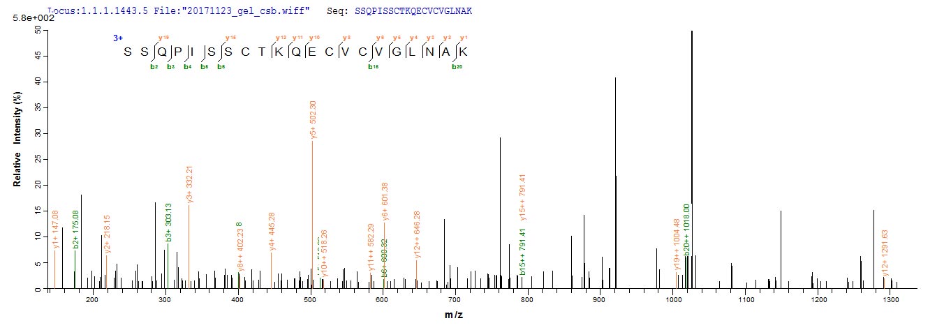 Based on the SEQUEST from database of Yeast host and target protein, the LC-MS/MS Analysis result of this product could indicate that this peptide derived from Yeast-expressed Vespula vulgaris (Yellow jacket) (Wasp) N/A.